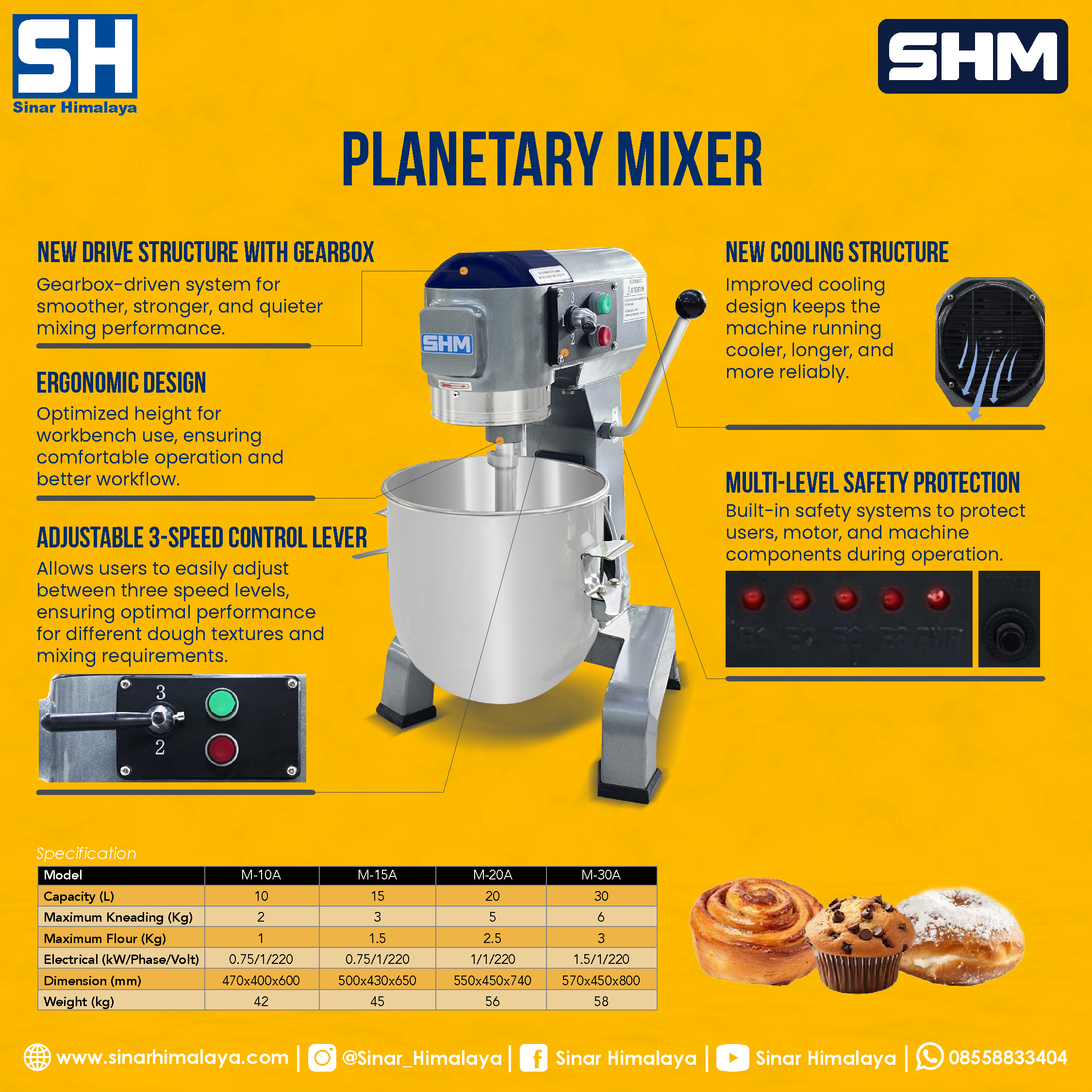 PLANETARY MIXER adalah mesin pencampur adonan yang sering digunakan dalam industri kuliner, terutama untuk pembuatan kue, roti, pizza, donat dan berbagai produk makanan lainnya. Mesin ini menggunakan sistem planetary mixing, di mana pengaduk berputar mengelilingi mangkuk sambil berputar pada porosnya sendiri. Teknologi ini memastikan adonan tercampur secara merata dan konsisten. Desainnya ergonomis dan user-friendly, serta mangkuknya bisa dilepas sehingga lebih mudah dibersihkan. Planetary Mixer ideal untuk usaha skala kecil hingga menengah yang membutuhkan alat pencampur adonan berkualitas dengan hasil yang konsisten. Cocok digunakan di toko roti dan bakery, hotel, restoran, cafe dan usaha sejenis lainnya.