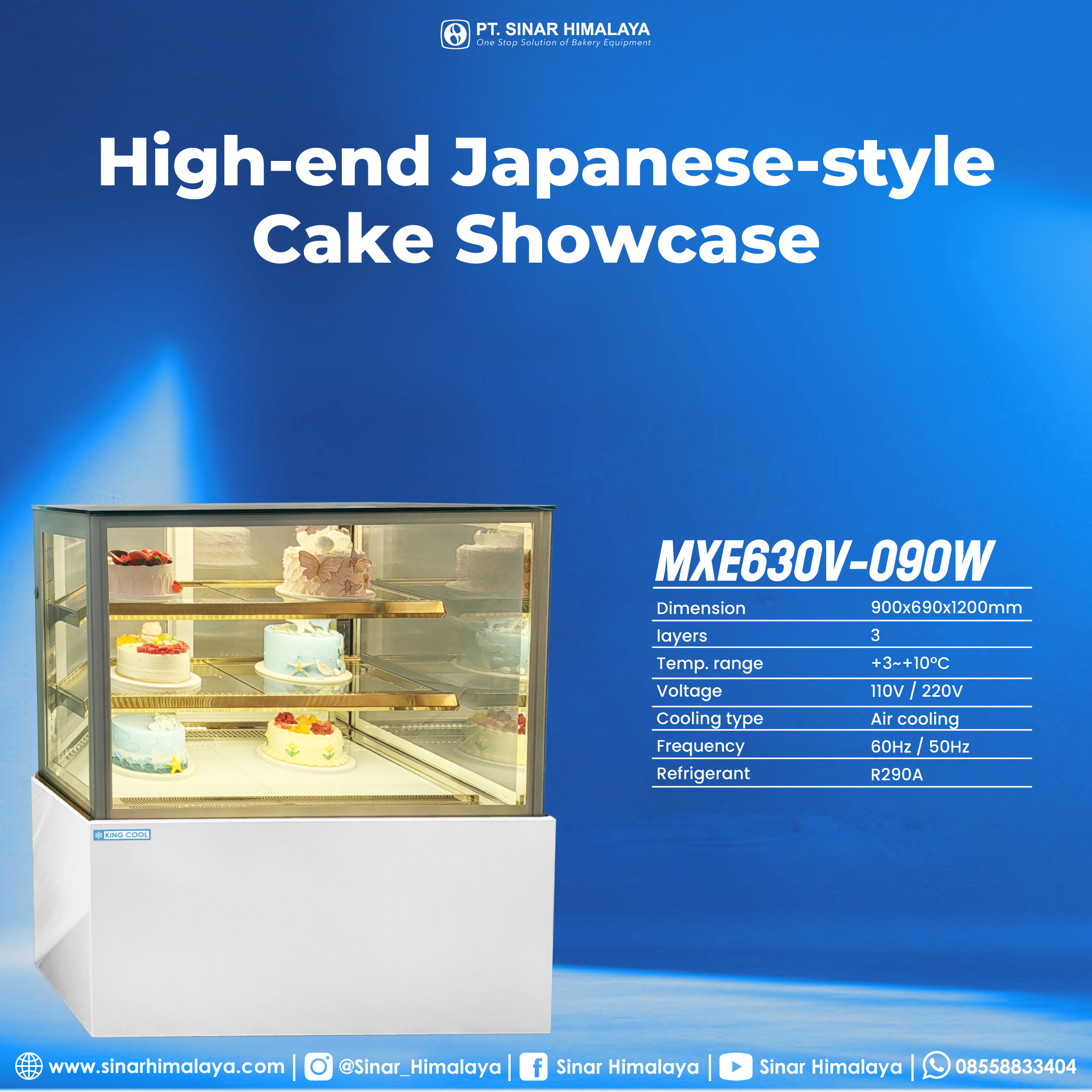 White High-End Japanese-Style Right-Angle Cake Display (Model: MXE630V-090W | King Cool) adalah lemari pendingin display premium bergaya Jepang yang digunakan untuk menyimpan dan menampilkan kue, roti, dessert, dan pastry agar tetap segar dengan suhu ideal antara +3°C hingga +10°C. Menggunakan sistem air cooling, mesin ini menjaga suhu merata di seluruh area display, memastikan tampilan produk tetap cantik, segar, dan bebas embun.