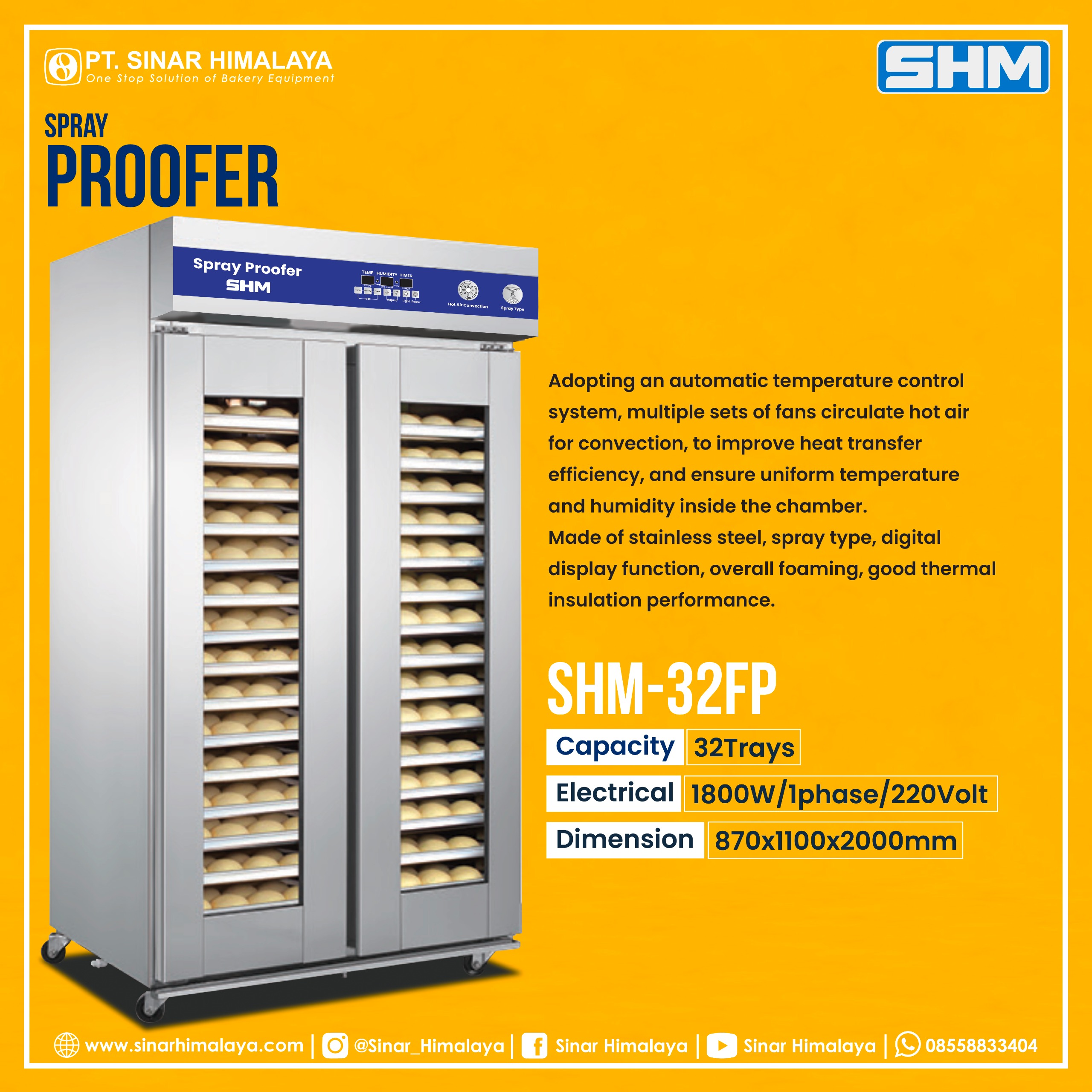SHM-32FP FOAMING SPRAY TYPE, Mesin proofer adalah mesin yang digunakan untuk mengembangkan adonan roti sebelum proses baking untuk menghasilkan roti yang lezat dan bertekstur sempurna. Memiliki 2 pintu dengan kapasitas 32 trays. Mesin ini sangat cocok bagi anda yang memiliki usaha bakery karena bisa meningkatkan efisiensi produksi roti, karena adonan dapat mengembang secara serentak dalam jumlah yang lebih besar.