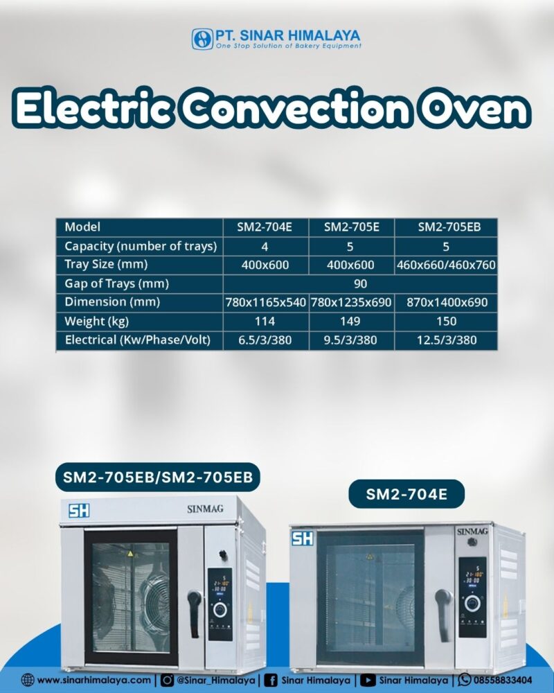 SM-705EB Electrical Convection Oven Series Sinmag Merupakan Oven Listrik Dengan Suhu Merata , Dapat Membuat Waktu Memanggang Menjadi Lebih Cepat Dengan Kapasitas 5 Tray. Selain Itu, Oven Listrik Ini Dilengkapi Dengan Kontrol Digital Yang Mudah Digunakan Untuk Mengatur Suhu, Uap, Dan Waktu Pemanggangan. Pintu Yang Dirancang Agar Tetap Dingin Saat Disentuh, Pintu Kaca Yang Mudah Dibersihkan, Desain Pelindung Di Bagian Pintu Guna Menghindari Cedera Yang Disebabkan Oleh Embusan Uap Panas Dari Ruang, Jadi Dijamin Saat Anda Menggunakannya Anda Akan Aman Tanpa Perlu Khawatir Dengan Panasnya Oven