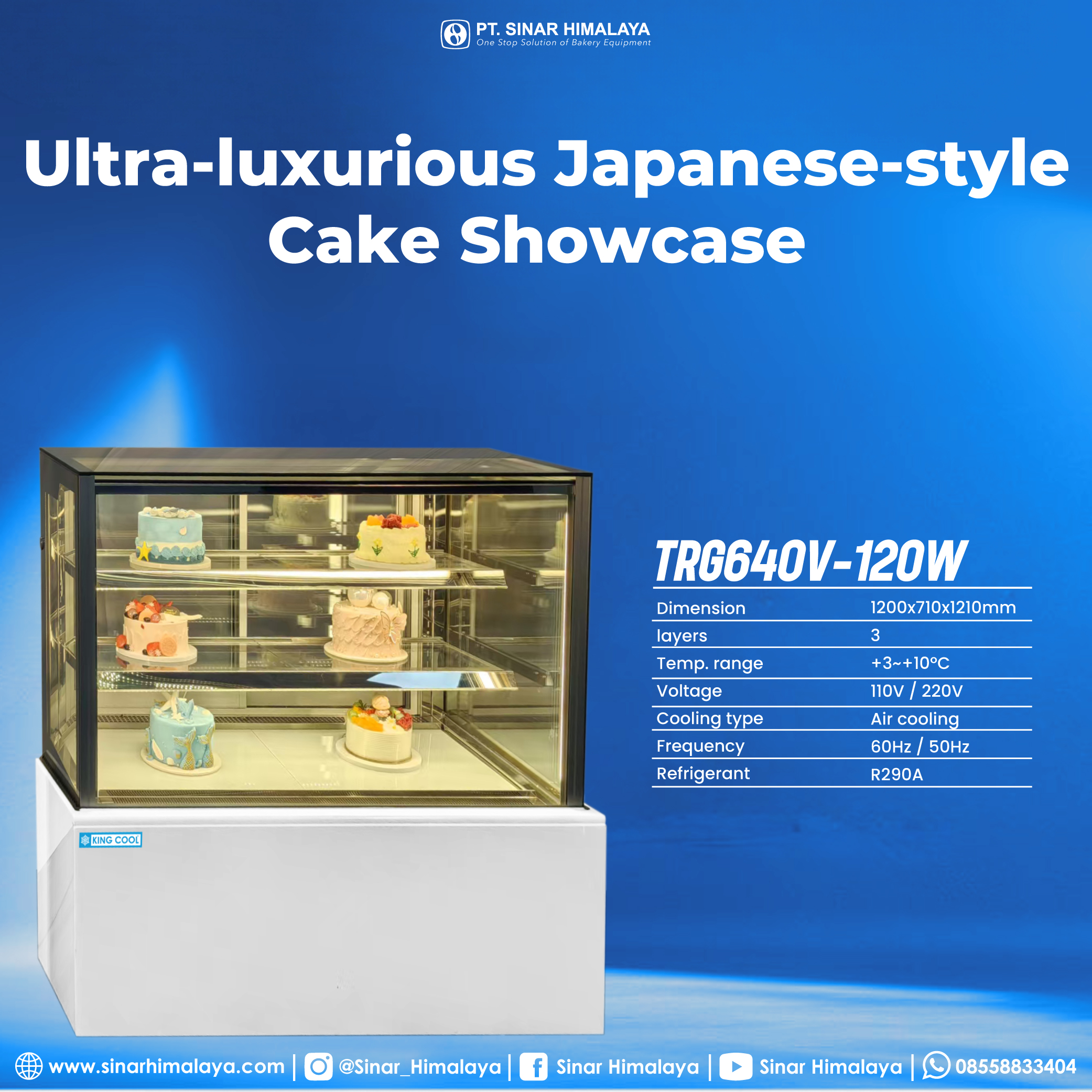 White Ultra-Luxurious Japanese-Style Right-Angle Cabinet (Model: TRG-640V-120W | King Cool) adalah lemari pendingin display mewah bergaya Jepang yang dirancang untuk menyimpan dan menampilkan kue, roti, pastry, dan dessert premium dengan suhu stabil antara +3°C hingga +10°C. Menggunakan sistem air cooling, suhu dingin terdistribusi merata ke seluruh area display, menjaga tekstur dan tampilan produk tetap segar tanpa embun di kaca.